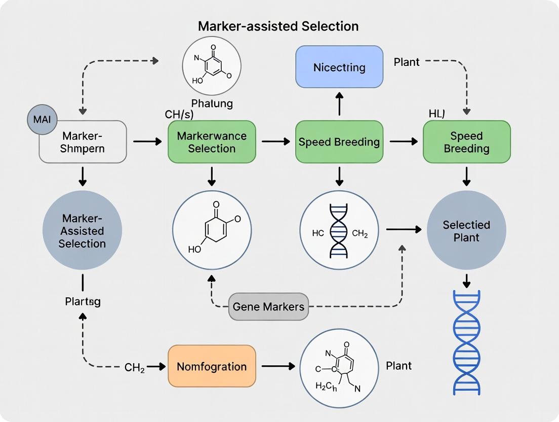 The integration of Marker-Assisted Selection and Speed Breeding represents a paradigm shift in crop improvement, effectively decoupling selection accuracy from generational time. This synthesis demonstrates that the combined pipeline addresses the core challenge of modern breeding: delivering genetically superior, complex varieties at a pace matching urgent global food security and climate adaptation needs. Key takeaways include the necessity of parallelized genotyping and phenotyping workflows, careful management of genetic resources, and robust economic validation. Future directions point towards tighter integration with genomic selection, AI-driven predictive breeding, and automated phenomics, paving the way for a fully digitized, accelerated breeding future with profound implications for sustainable agriculture.