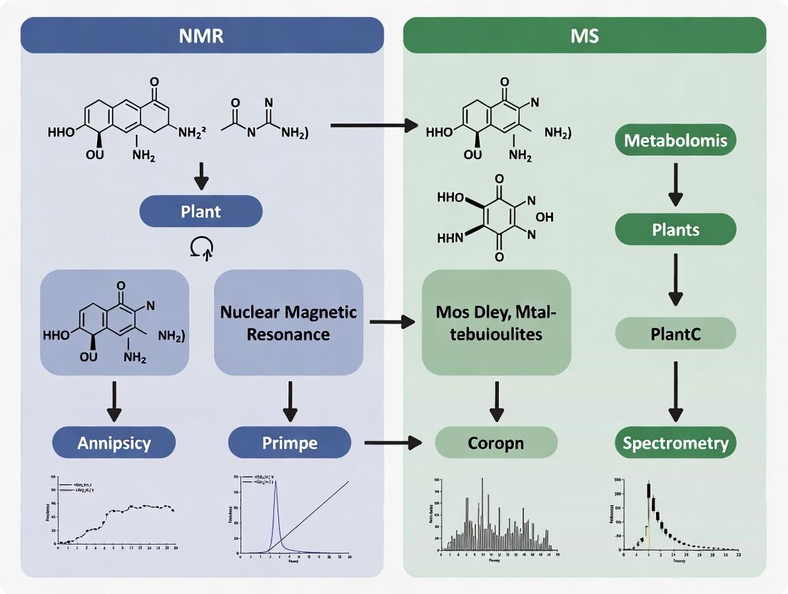 This comprehensive analysis provides researchers, scientists, and drug development professionals with a detailed comparison of Nuclear Magnetic Resonance (NMR) spectroscopy and Mass Spectrometry (MS) for plant metabolomics. We explore the foundational principles of each technique, their specific methodological workflows and applications in phytochemistry and drug discovery, common challenges and optimization strategies, and a rigorous head-to-head validation of their capabilities for metabolite identification, quantification, and high-throughput screening. The article synthesizes current best practices to guide the selection, integration, and validation of these analytical platforms for robust and reproducible plant metabolomics studies.