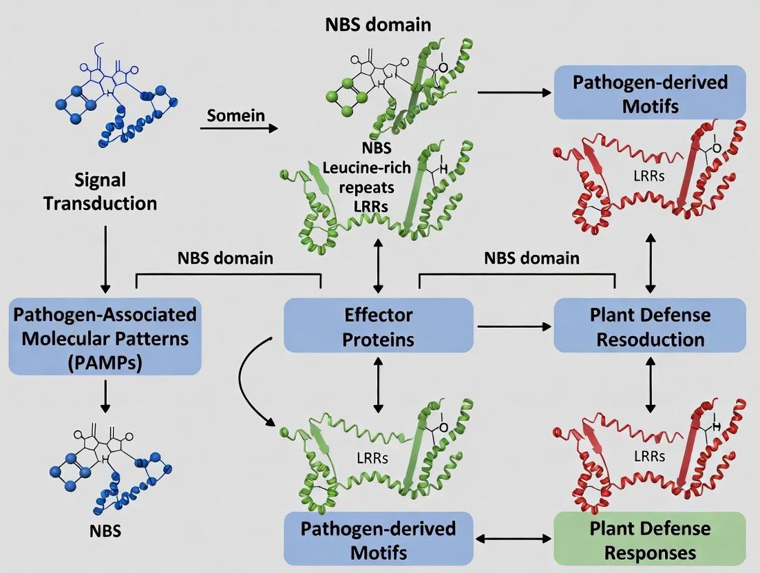Plant and animal NLRs share a tripartite domain architecture: a variable N-terminal effector domain, a central NBS domain for nucleotide-binding and oligomerization, and a C-terminal leucine-rich repeat (LRR) domain for ligand sensing and regulation. The NBS domain is the conserved molecular switch, cycling between ADP-bound (inactive) and ATP-bound (active) states to control the assembly of signaling complexes (resistosomes in plants, inflammasomes in humans).